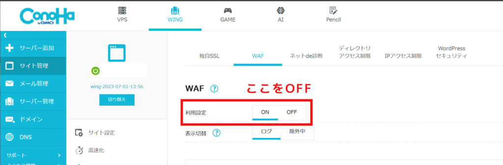 | 第二候補 | ConoHaのWAF設定を一時的に「OFF」にする |
