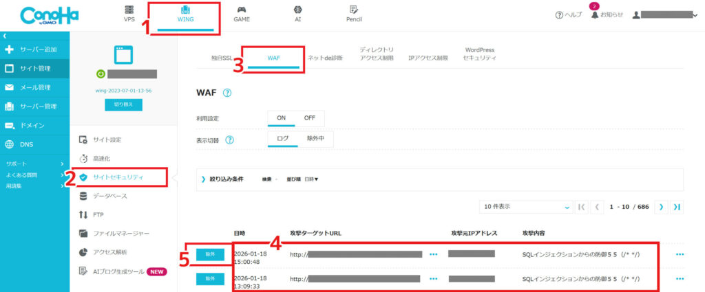 | 第一候補 | ConoHaコントロールパネルのWAFログで「除外」をクリック |