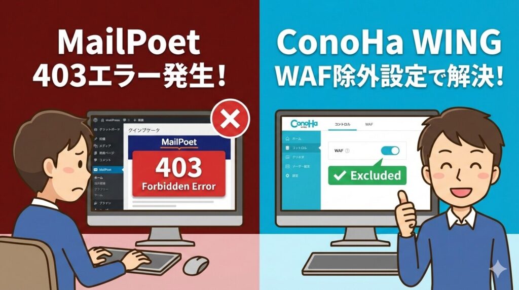 ConoHa WINGをお使いで、MailPoetのフォーム保存時に403エラーが出る場合、原因はほぼ間違いなくサーバーのWAF(Web Application Firewall)による誤検知です。