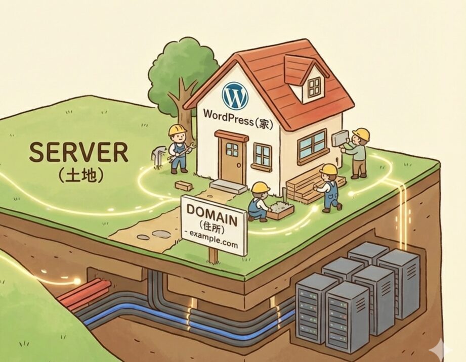 よく言われるわかりやすい例えとして、WordPressを家とするなら、それを建てる「土地(サーバー)」と、場所を示す「住所(ドメイン)」が必要です。